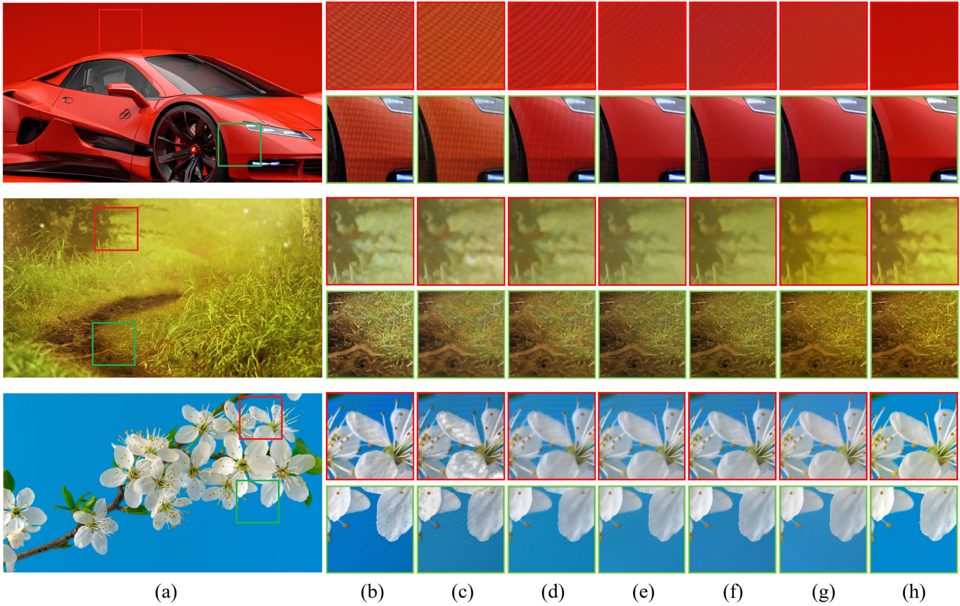 图3 UHDM数据集上不同图像去摩尔纹方法的定性比较。(a)清晰图像,(B)摩尔图像,(c)DMCNN ,(d)MBCNN,(e)ESDNet,(f)ESDNet-L ,(g)Ours,(h)Ground-truth。我们的方法比其他方法实现了更好的去摩尔纹性能和颜色恢复结果。