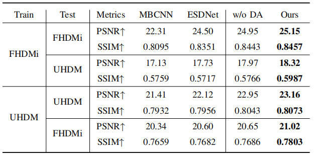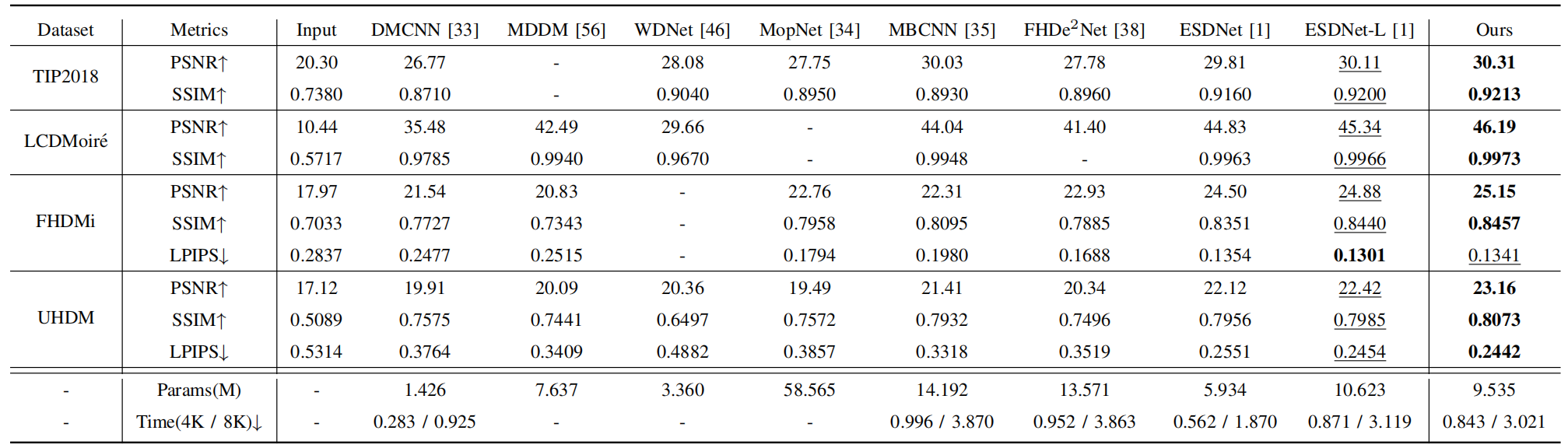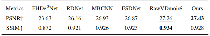 本文在四个公开数据集上进行了全面评估,包括UHDM、FHDMi、LCDMoiré和TIP2018。实验结果表明: