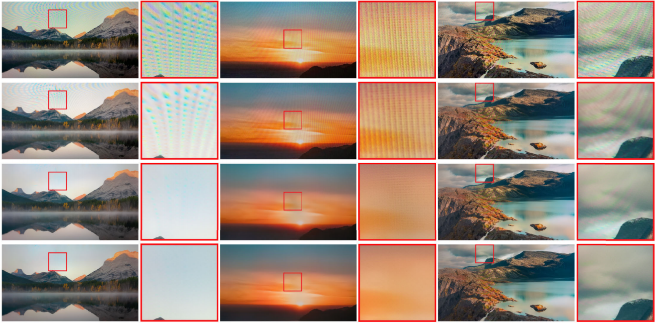 图像去摩尔纹是图像复原领域的一项重要任务,旨在消除因相机传感器与显示屏子像素之间的不匹配或高频信息干扰而产生的彩色条纹、网格或波纹状伪影。随着移动设备拍摄图像分辨率的不断提升,超高清图像中的摩尔纹呈现出更复杂的频率分布和尺度耦合特性,给现有模型带来了严峻挑战。