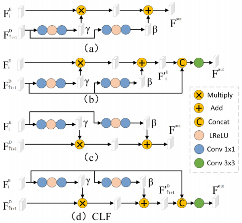 图2 (a)是基于浅特征的融合方法,在现有方法中常用。(B)在(a)的结构基础上进一步融合深特征。(c)是基于深特征的融合方法。(d)在(c)的结构基础上进一步融合浅特征,即本文提出的CLF模块。