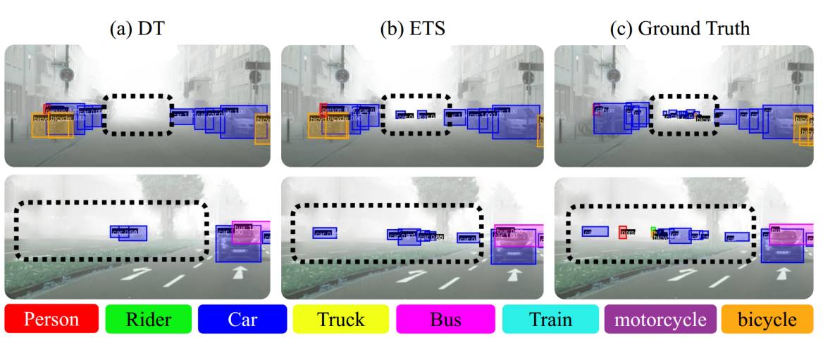如图2的可视化所示,与完全摒弃教师模型的 DT 方法相比,ETS 成功保留了由教师模型提炼的特定领域知识。例如,在浓雾遮挡的区域,ETS 依然能够精准地推断并定位出隐藏的汽车,展现出极强的抗干扰与环境适应能力 。