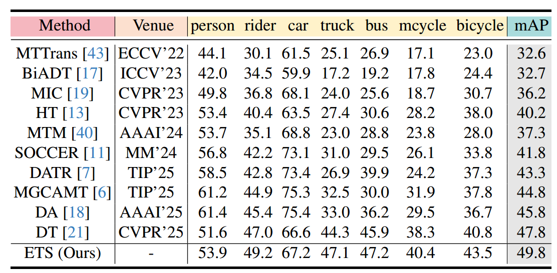 表3是正常到恶劣天气的迁移。在模拟大雾天气的场景中,ETS 取得了 56.2% 的最佳 mAP 。在“公交车”、“火车”等稀有类别上的显著提升,不仅验证了 VFM 泛化知识迁移的成功,更证明了专家与教师协同学习机制在恶劣环境下的鲁棒性 。