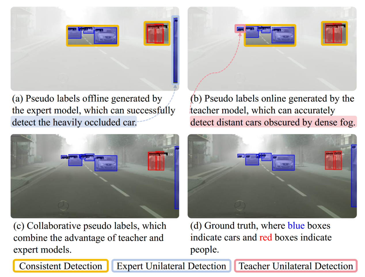图1 检测结果的可视化。我们使用不同的方框颜色来表示一致和单侧检测结果。
